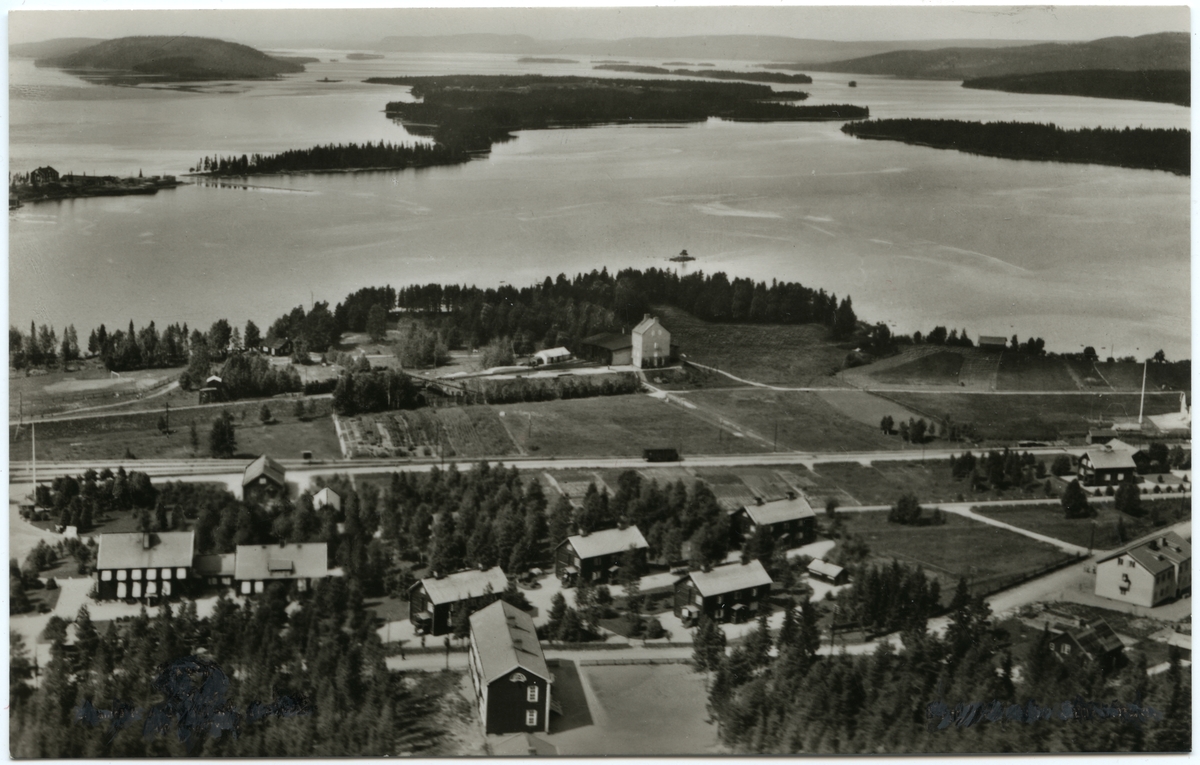 Titel: Flygbild över Storumans samhälle och bangård.