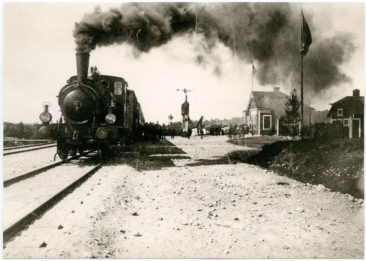 Titel: Invigningståget på Varberg Ätrans Järnväg vid Gällareds station draget av VbÄJ lok 1.
