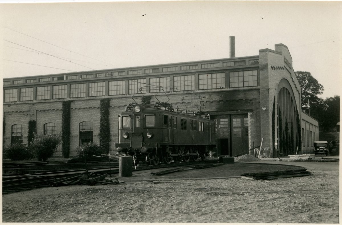 Titel: Exteriör av Hagalunds lokstation med ett Statens Järnvägar SJ Ds lok.