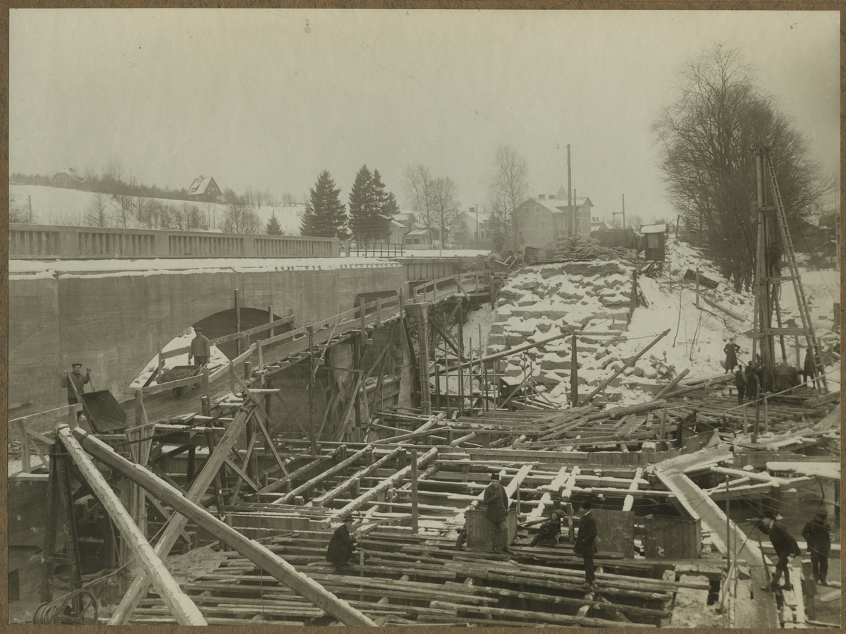 Dubbelspårsbyggnaden mellan Alingsås - Olskroken. Bron över Säveån vid Lerum. Gjutning av landfästen för norra brohalvan.