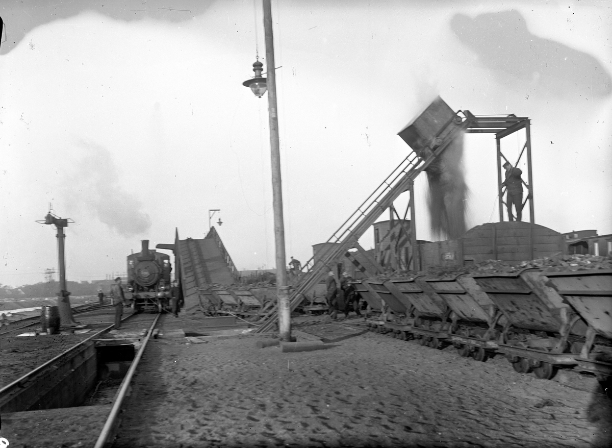 Ett Statens Järnvägar, SJ Ta har en vajer kopplad i dragkroken och har dragit upp slaggvagnen för tömning av slaggen i I3-vagnen till höger. Loken användes även för att dra de stenkolslastade tippvagnarna upp på kolbryggan.
