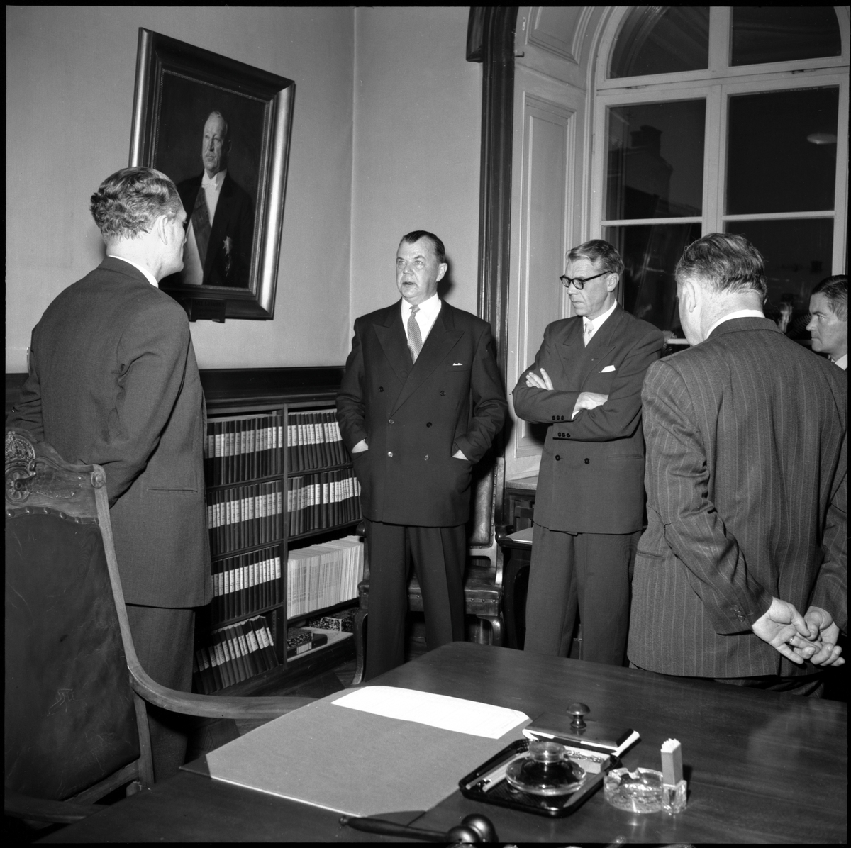 Jernbanedirektör Leif Tveten och redaktör Tryggve Ström överlämnar Nordes stadsbanor NSB gåva, Rallaren till Statens Järnvägar SJ Genrealdirektör Erik Upmark.
