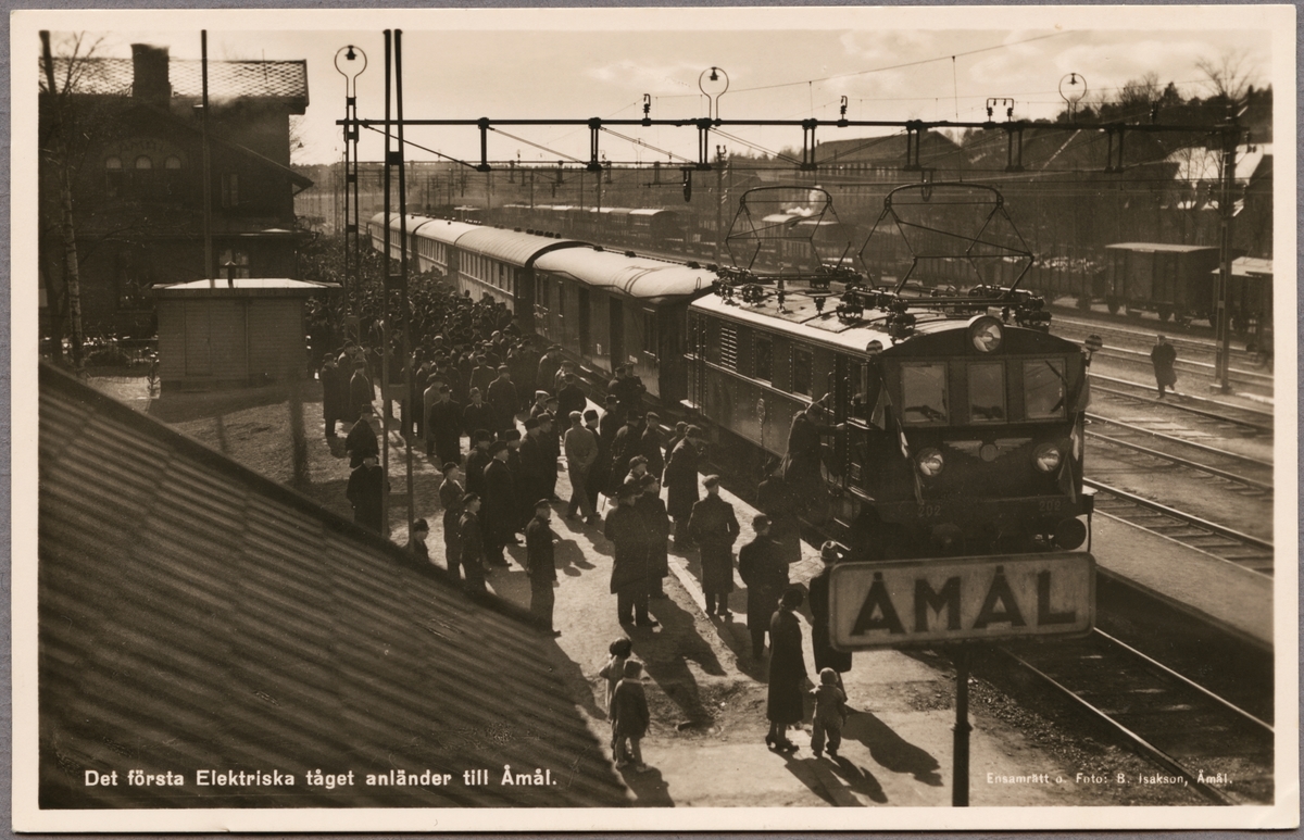Det första Elektriska tåget anländer till Åmål. Bergslagernas Järnväg, BJ Ds 202.