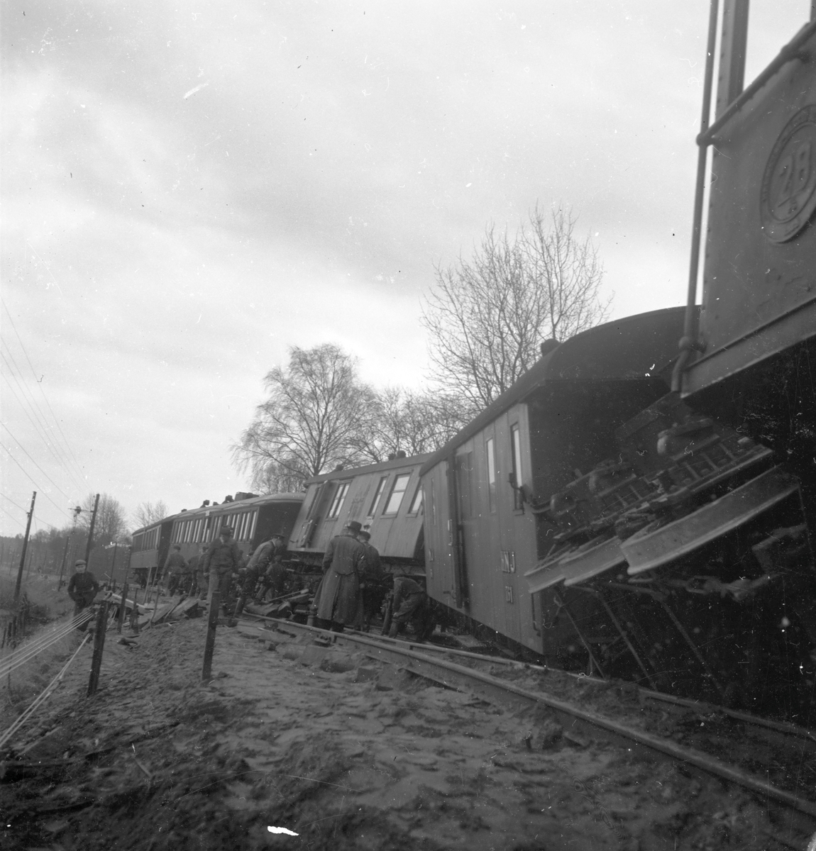 Längst till höger syns här ångloket HNJ 28 som tillverkades av Atlas 1909, strax bakom ligger den urspårade tendern följt av resgodsvagn F3 761, tillverkad 1913, Postvagn HNJ 19 och slutligen de två personvagnarna. Den främsta av dem är HNJ 1011, tillverkad av Atlas 1907.