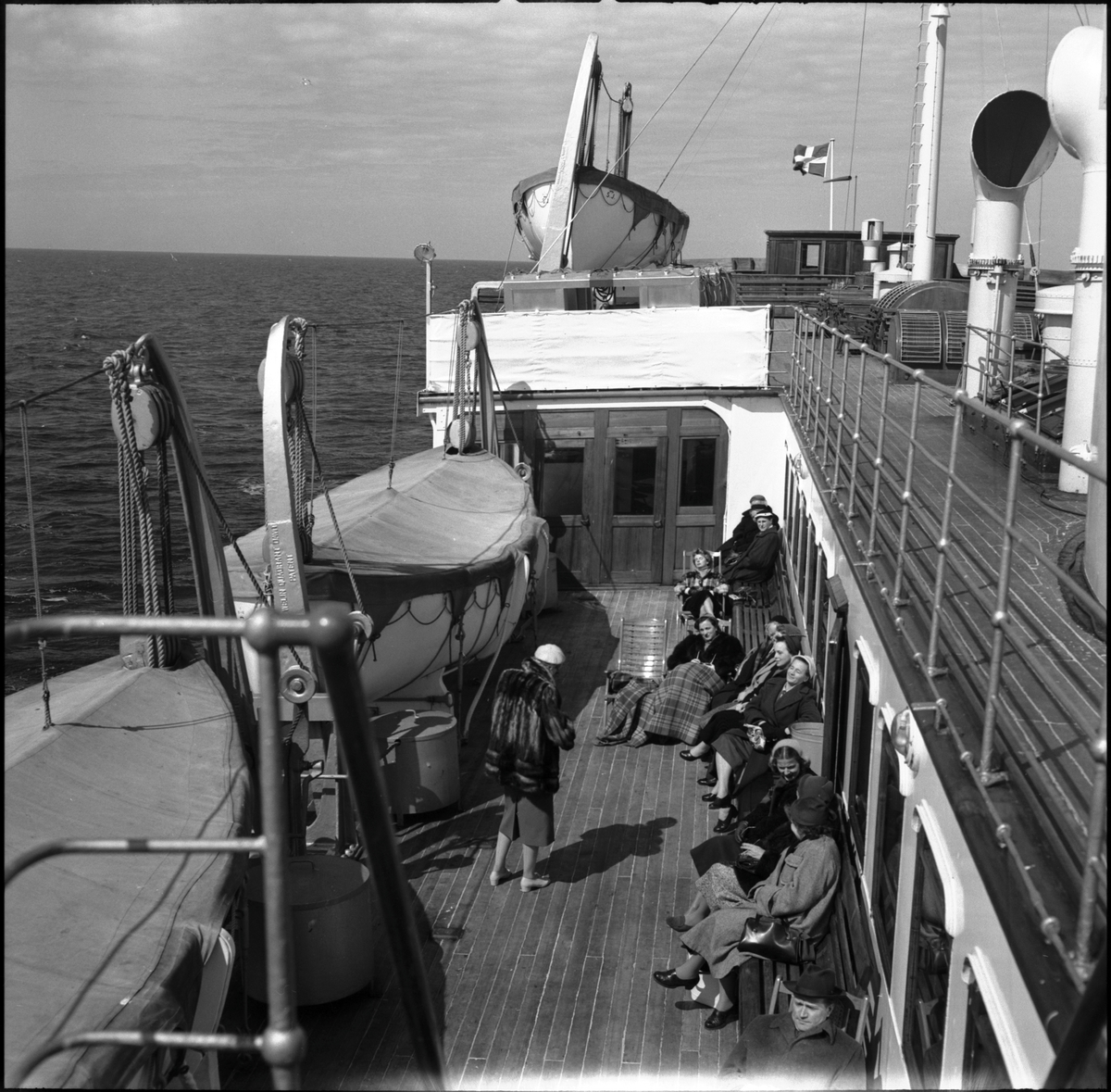 Tågfärjan Drottning Victoria, däcksmotiv. Färjeläget i Sassnitz. Hjälpkryssaren Drottning Victoria var en svensk tågfärja tillhörande Statens Järnvägar. Drottning Victoria trafikerade normalt linjen Trelleborg Sassnitz. Den medverkade som hjälpkryssare i svenska marinen under andra världskriget. På bilden syns passagerarna som njuter i fulla drag på färjedäcket.