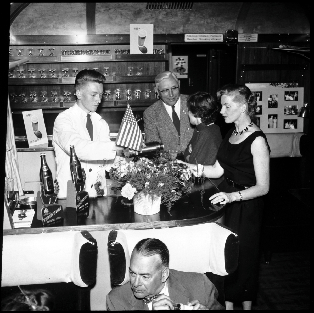 Interiör barvagnen, Swedish Night Light Cruising, SNLC. "Dollartåget" uppkom som ett försök att minska efterkrigstidens valutabrist, man riktade sig i första hand till köpstarka amerikanska turister, därav det myntade namnet