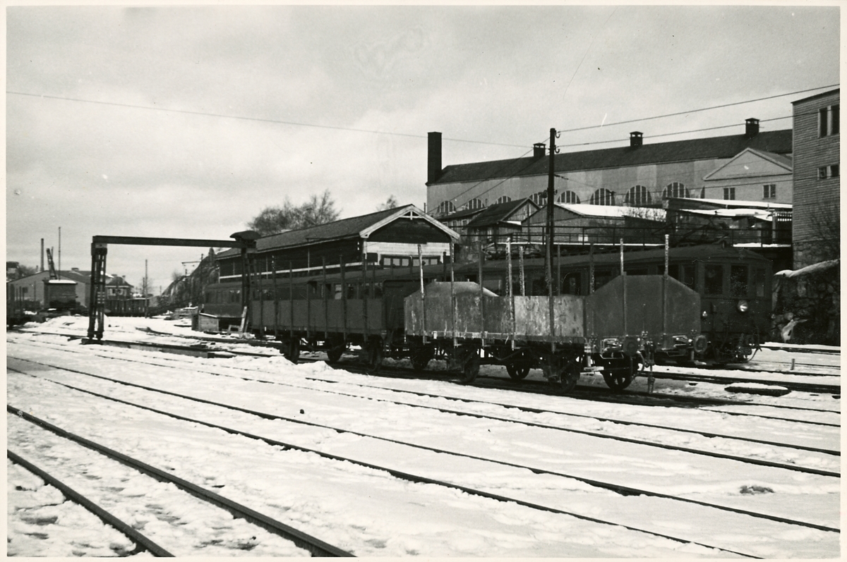 Inför normalspårsdelens elektrifiering och ombyggnad. Motorvagnen bakom Os- och Or-vagnarna är en av stockholm - Roslagens Järnvägar, SRJ 7-13. Tågsättet den är kopplad till står framför motorvagnsstallet. Bakom bockkranen gods och omlastningskajer.
