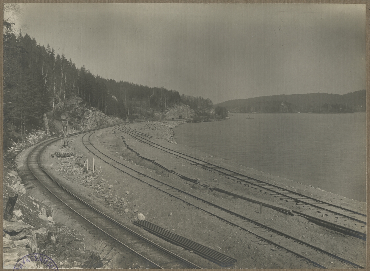 Dubbelspårsbanbyggnad Göteborg - Alingsås. I förgrunden syns det provisoriska förbigångsspåret, med en 210 meters radie och platsen är banken vid sjön Stora Sävelången väster om Norsesund, år 1916.