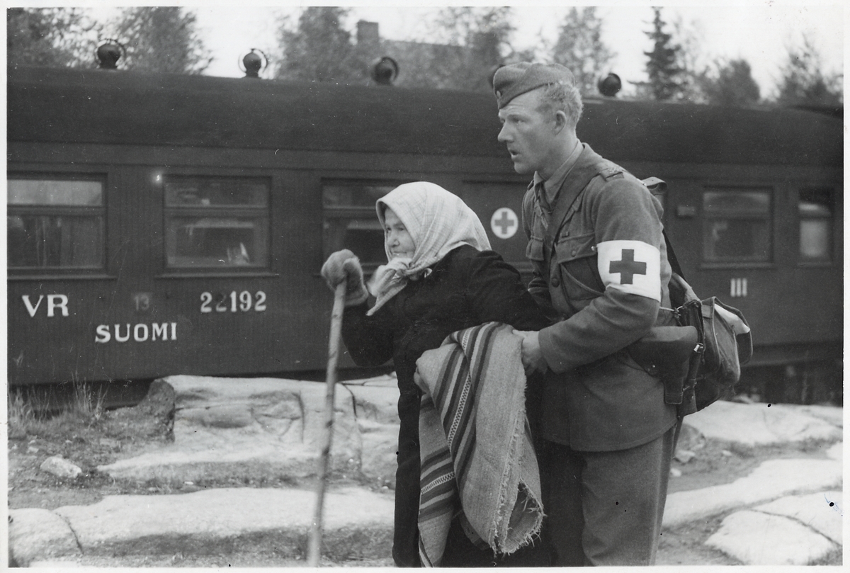 Finsk flykting får assistans av militärsjukvårdare i Haparanda, hösten 1944. Valtionrautatiet (Statsjärnvägarna), VR 22192.