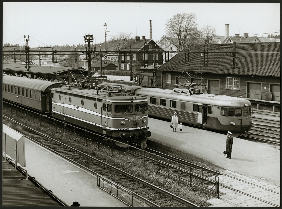 Statens Järnvägar, SJ Rb 1005 och Trafikaktiebolaget Grängesberg - Oxelösunds Järnvägar, TGOJ motorvagnståg Yoa202 som senare fick beteckningen X21vid stationen i Flen maj 1964.