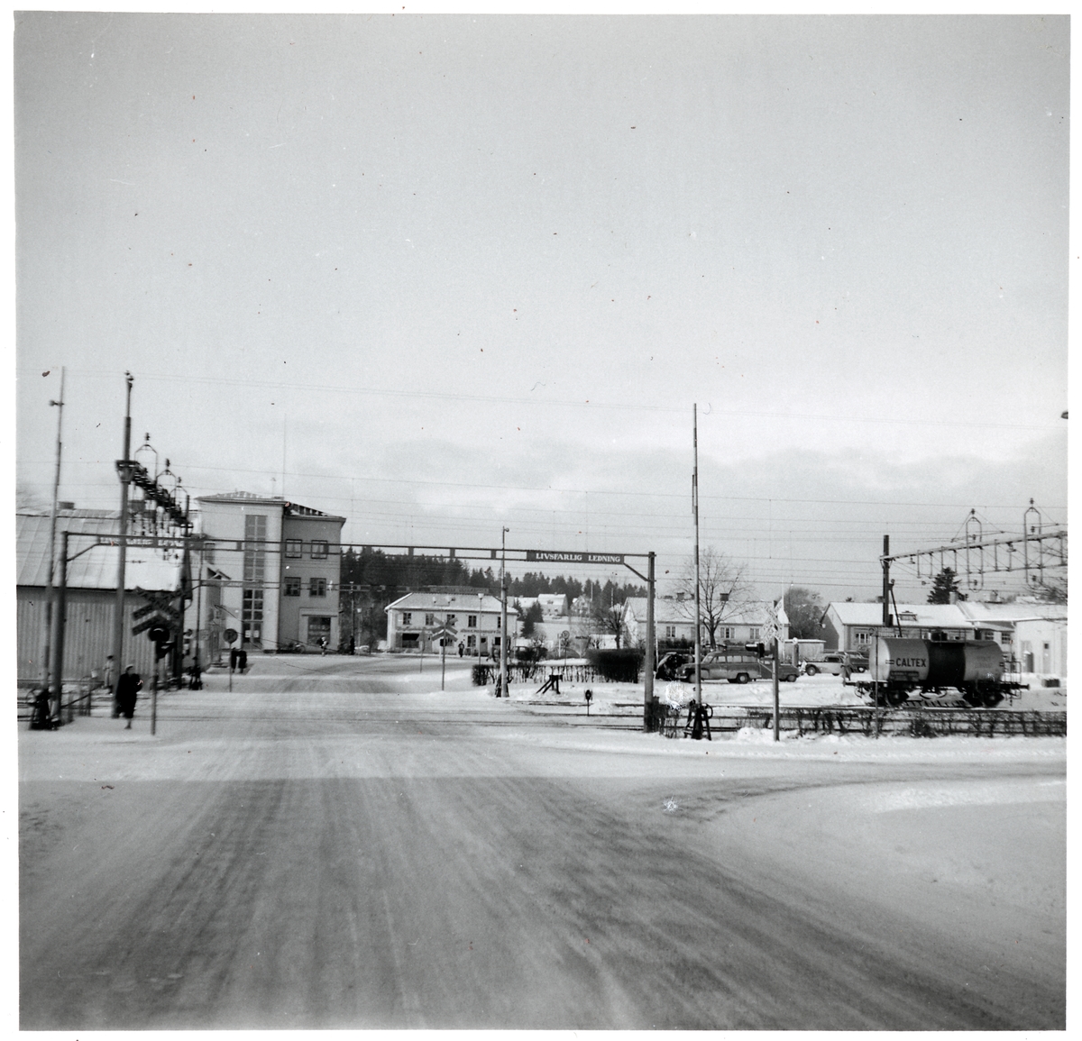 Titel: Järnvägsövergång vid Sävsjö station. På spåret står en Caltex tankvagn.
