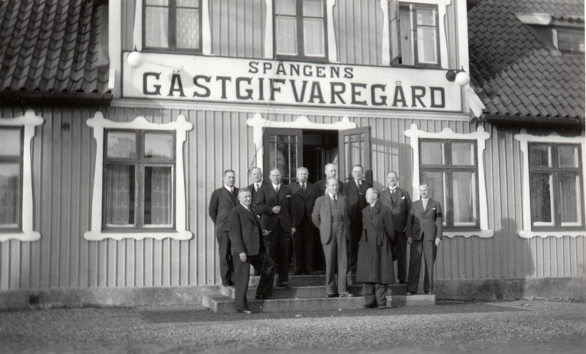 11 herrar avbildade på trappan till Spångens gästgivargård 3/12 1940 vid en resa över f. d. HHJ.