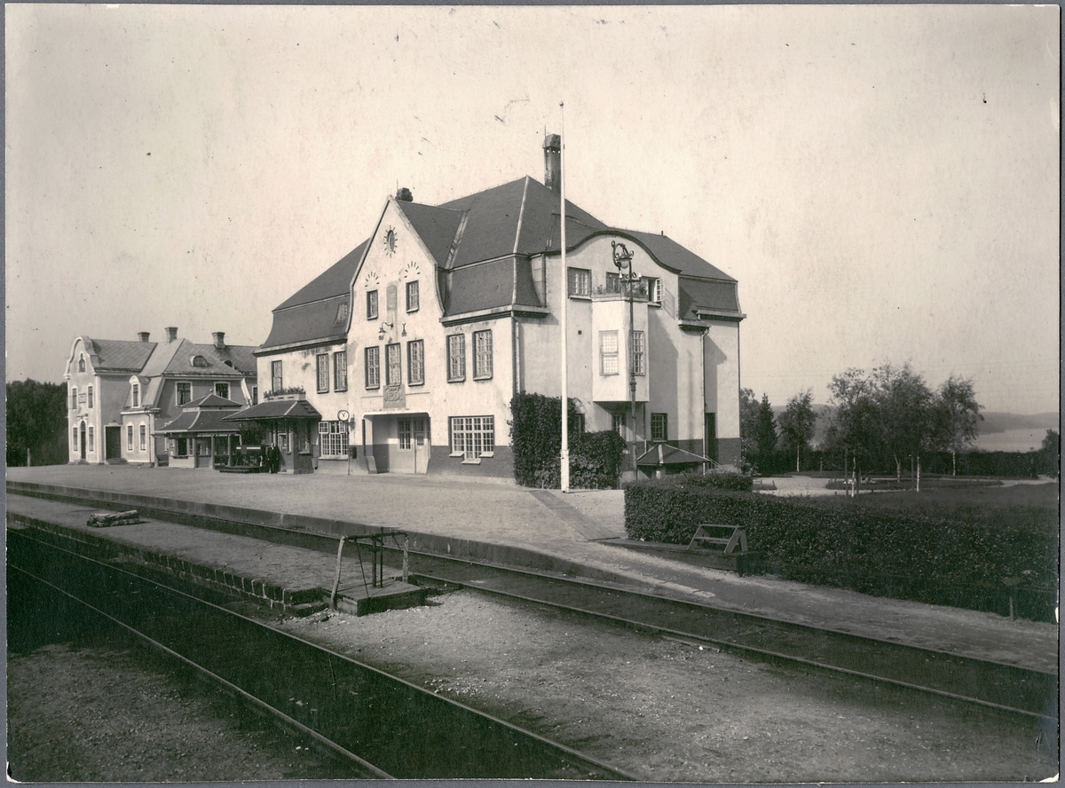 Pingstaftonens förmiddag 1910 brann stationen ned till grunden tillsammans med Hotell Drott, Lilla Hotellet och Järnvägshotellet. Stationsbyggnaden var från sitt ursprungliga skick påbyggd med en våning, samt en farstu norrut. 1912 stod det nya stationshuset färdigt. Intill dess användes en reservstation i en fastighet som tillhörde DJ och som låg vid spårområdet på södra sidan.