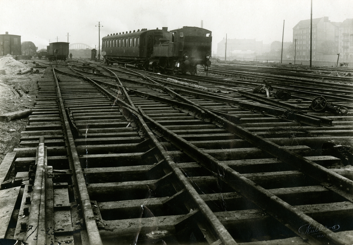 Bangården vid Malmö station. Malmö Centralstation. Ett ånglok SJ Ke växlar en personvagn littera SJ Co8.