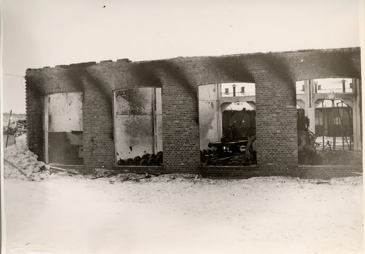 Från branden i Gällivare lokstall. Yttervy av brandskadad lokstall 19 - 21, sedd från baksidan