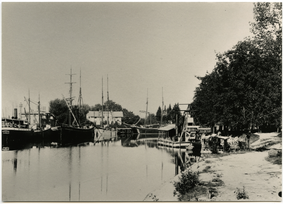 Titel: Köpings hamn med järnvägsstationen till vänster och järnvägshotellet i mitten i bakgrunden.