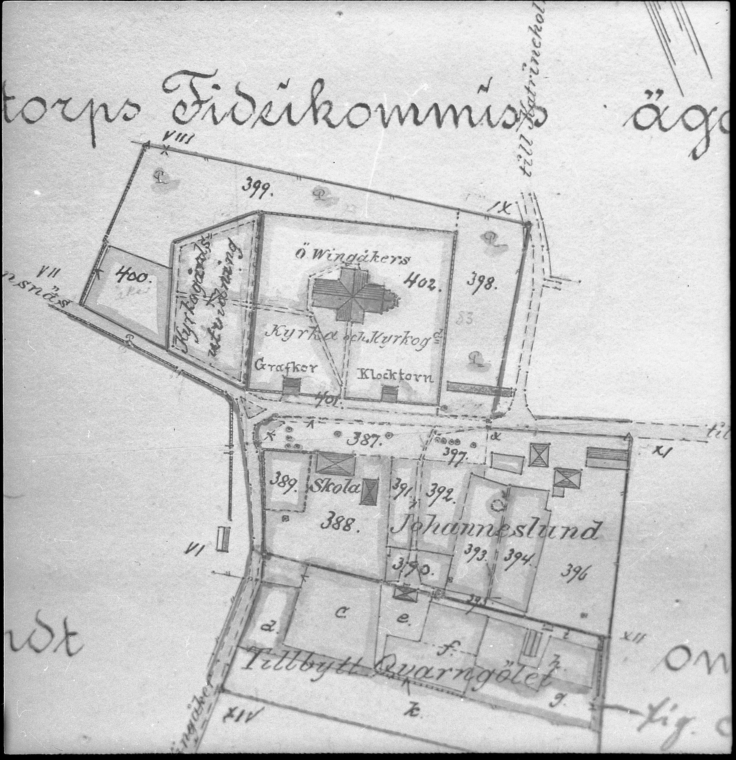 Foto av karta över nuvarande kyrkan innan den långa kyrkstallängan flyttades.