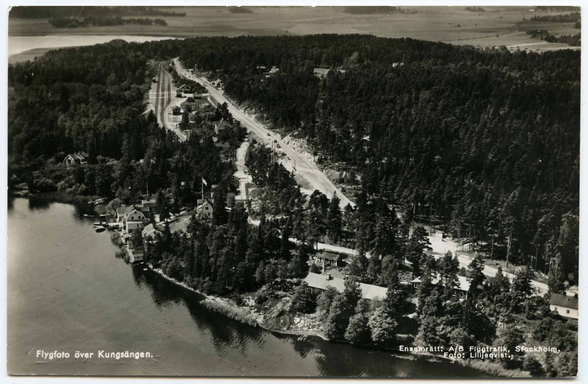 Flygfoto över Kungsängen, längs järnvägen där spåret går ut i tre spår ligger ortens järnvägsstation. Sjön till vänster är Mälaren i den del som kallas Mörväln.