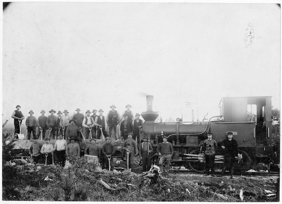 Titel: Rallare och banbyggnad på Stockholm - Roslagens Järnväg (SRJ). SRJ lok 3 "Rimbo".