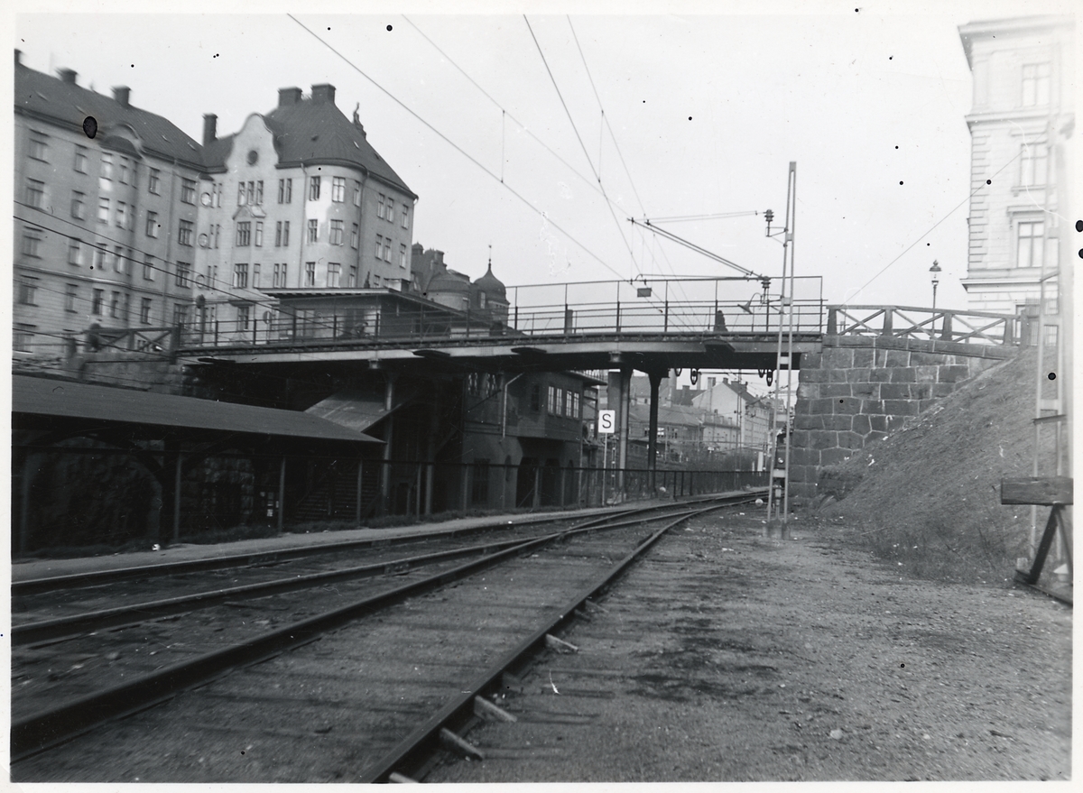 Timmermansgatans bro över spårområdet vid Stockholm Södra Station. Stationsbyggnaden till vänster straxt bakom bron