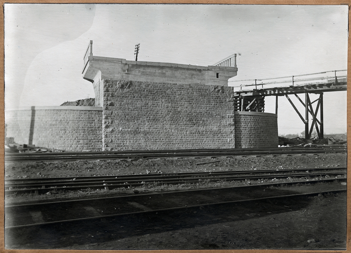 Byggnation av vägbro över bangården vid Lund centralstation. Uppförande av västra landfästet, december 1924.