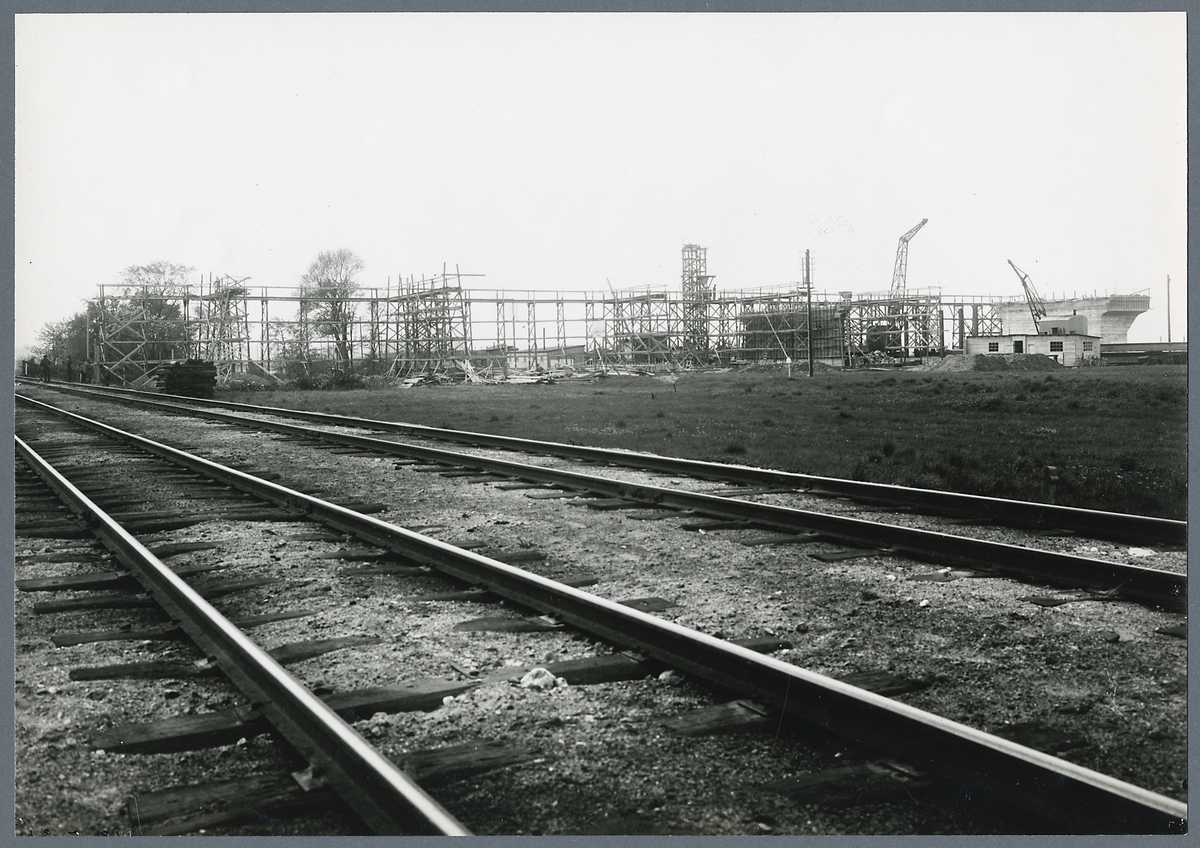 Byggnation av Sjölundaviadukten, norra landfästet och pelare 5.
