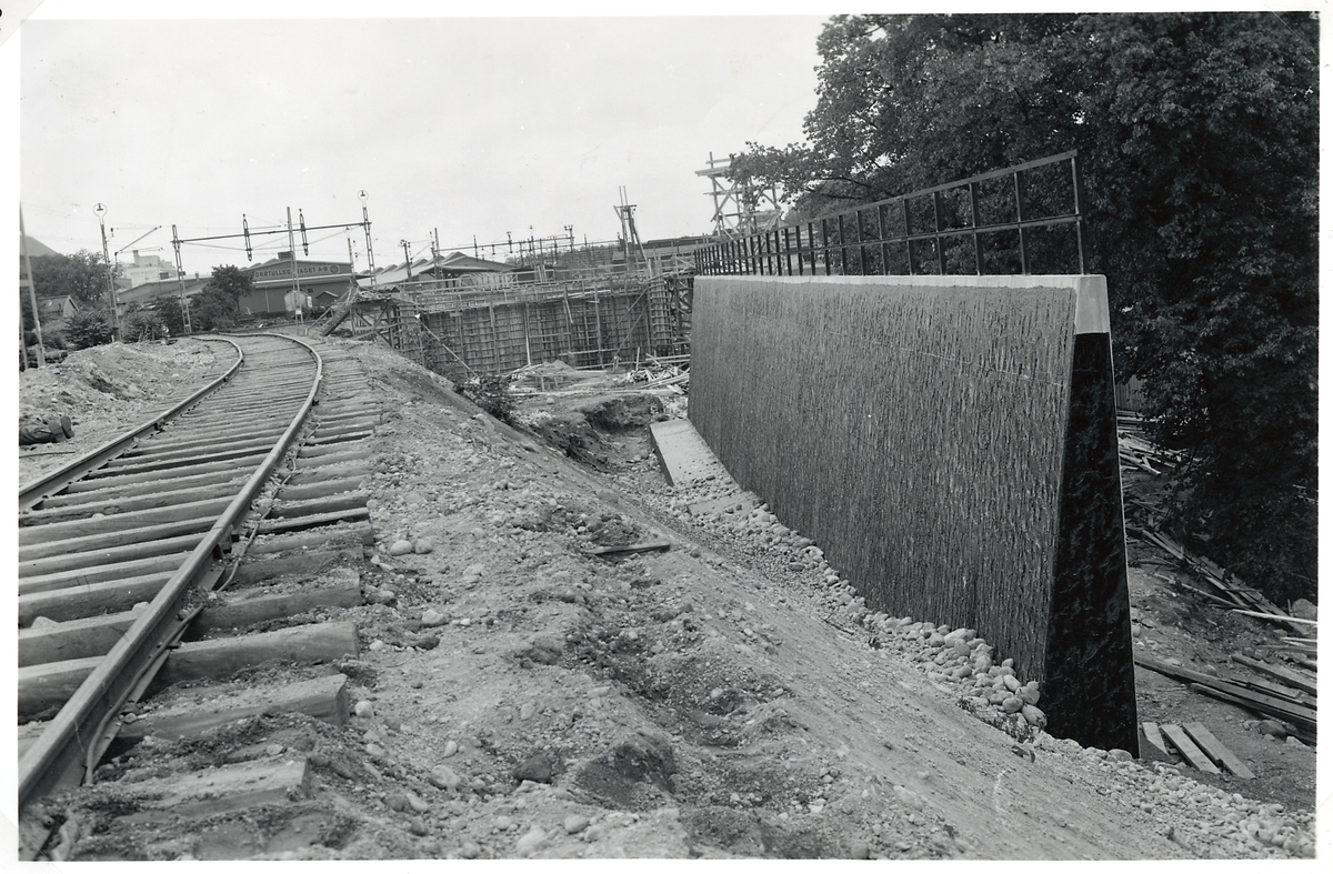 Uppförande av stödmur för järnvägsbanken vid byggnationen av ny järnvägsviadukt över Norrtullsgatan. Belägen ca 100 m öster om östra landfästet i nya vidaukten. Fyllningen bakom muren pågår.