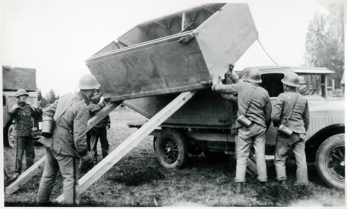 Lossning av brodelar från lastbil.