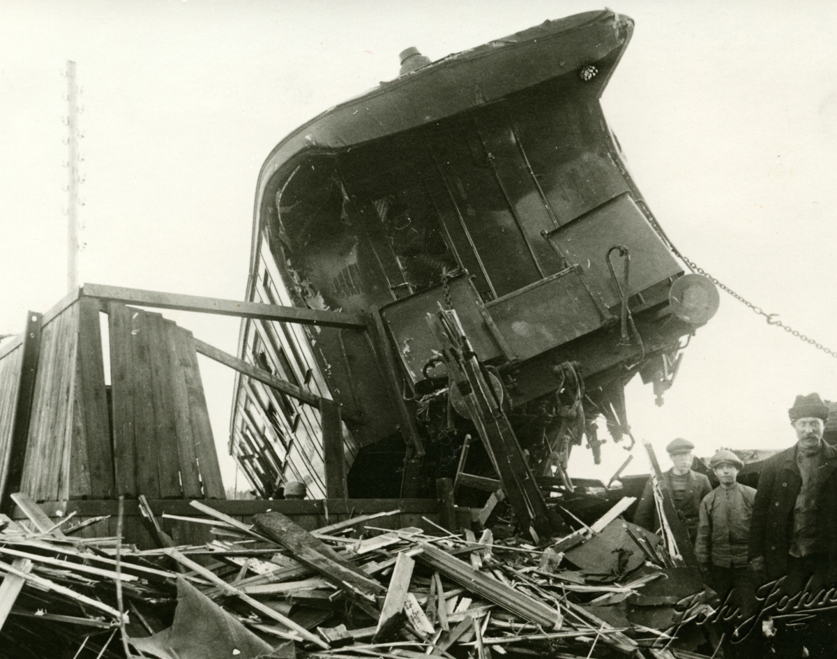 Tågolycka i Holmsveden 1917-02-16. Snälltåg 3048, draget av ånglok SJ B 1324, leddes på grund av en fellagd växel in på ett sidospår och spårade ur.