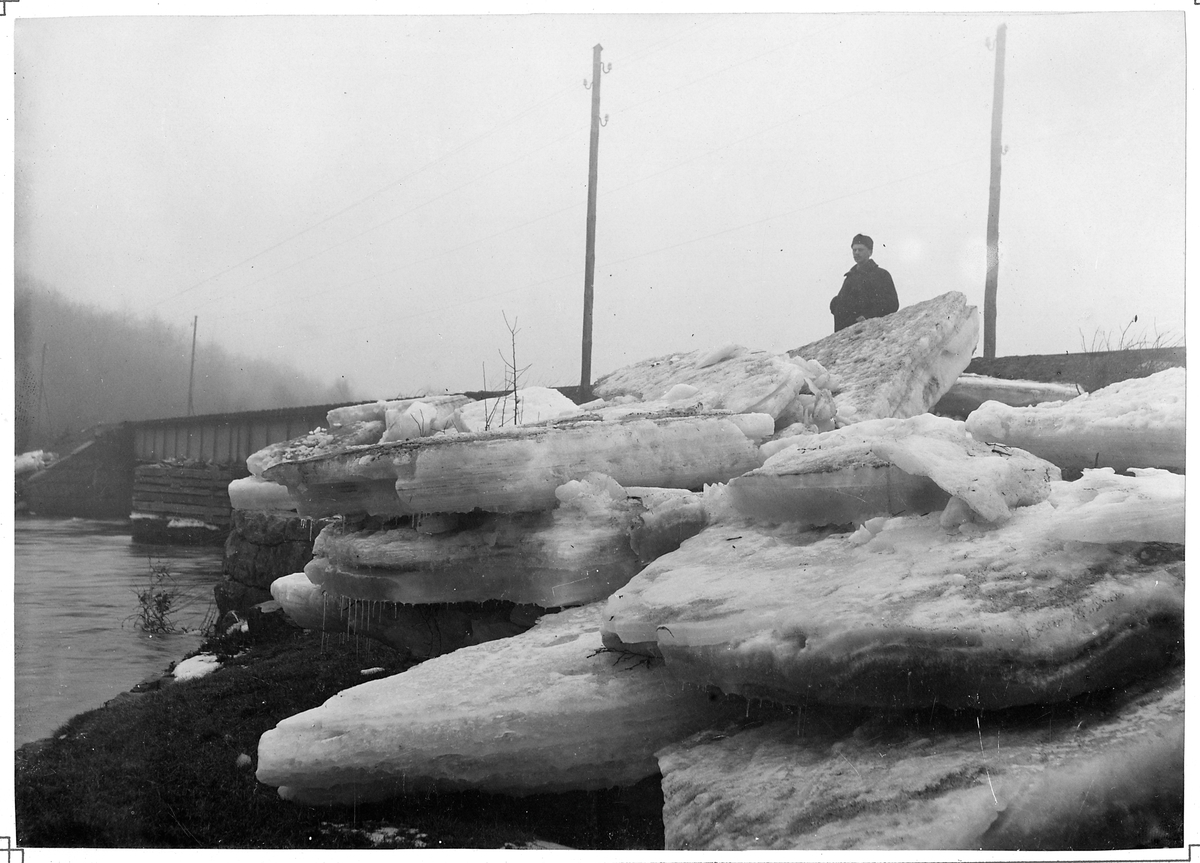 Järnvägsbron med isblock på banvallen, Svalsundsbron.