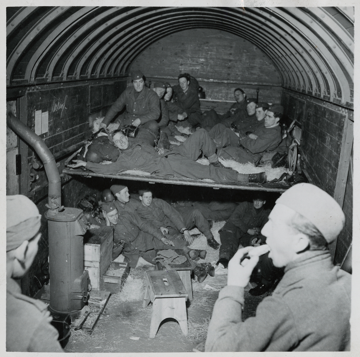 Titel: Militärtransport på linjen mellan Nässjö - Falköping. Ombyggd godsvagn för husering av soldater.