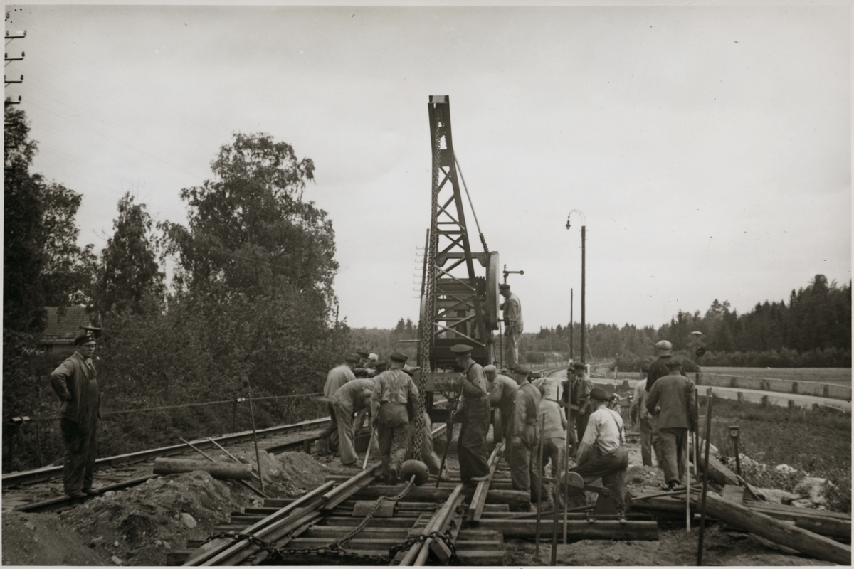 Växelflyttning på 1940-talet. Mats Svärd (till vänster) övervakar manskapet som för hand flyttar växeln mellan spår 1 och 2 i södra delen av Hälleforsnäs bangård.