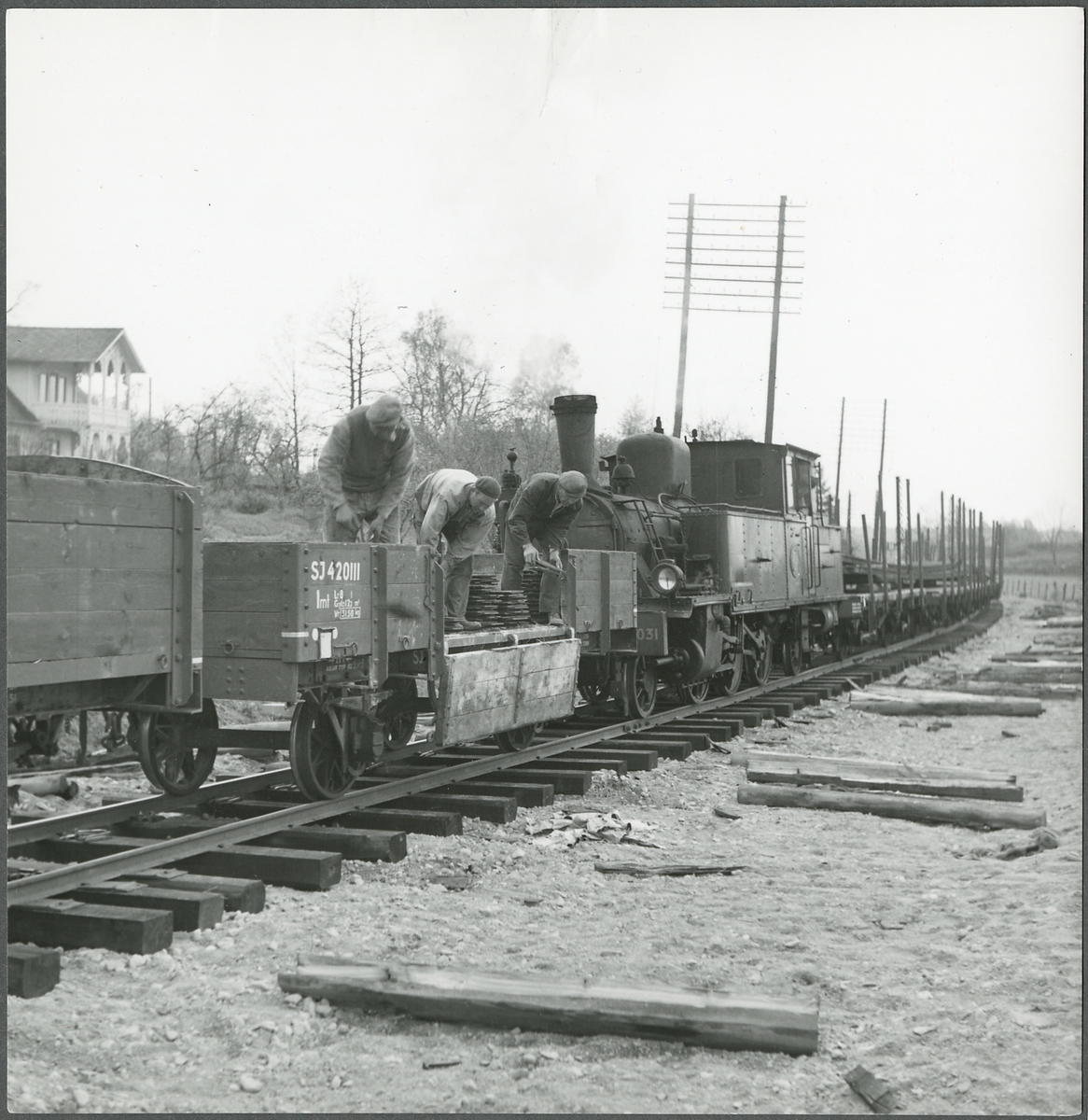 Järnvägsbygge med ångloket SZD Esh 4031 och vagnen Statens Järnvägar, SJ 420111 på linjen mellan Kristianstad-Karlshamn.