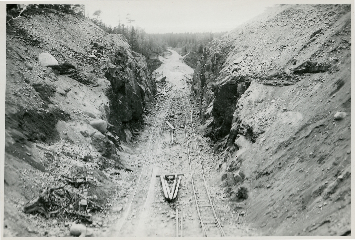 Rälsläggningen mellan Ulricehamn och Jönköping. Decauvillespår, de färdiga rälslängder användes som provisoriska banor för banarbetsfordon.