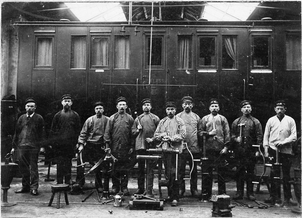 Verkstadspersonal från Malmö. Tredje man från höger är Anders Lagerholm. Vagnen bakom är en Statens Järnvägar, SJ B3a eller B3b, tillverkad 1874-1876.