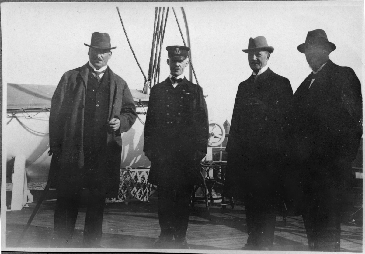 Dåvarande generaldirektör för Statens Järnvägar, Axel Granholm, Kapten Lysander, dåvarande generaldirektör för Norges Statsbaner, Christian Theodor Holtfodt, samt Distriktschef E. K. Bergström.