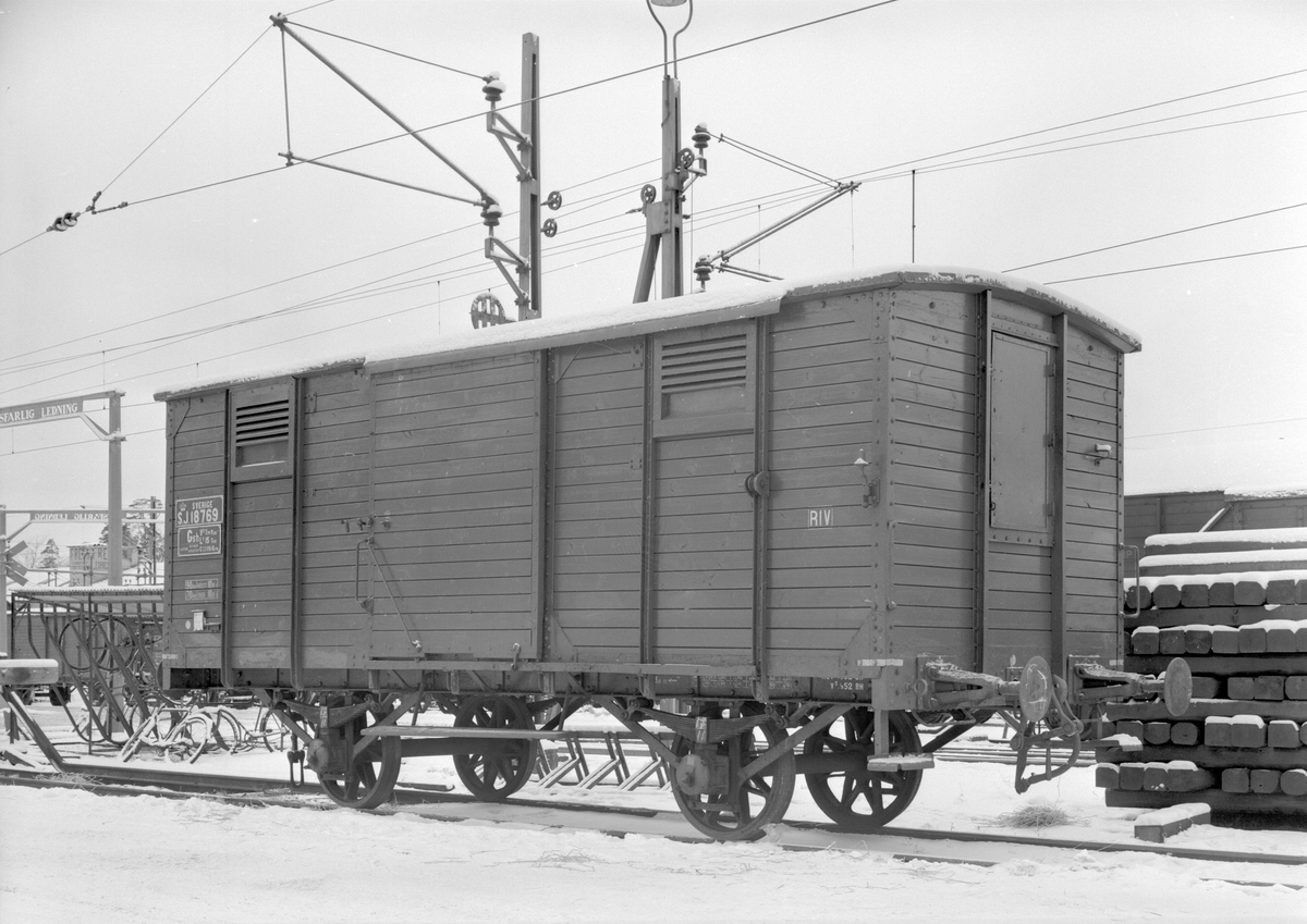 Statens Järnvägar, SJ Gsh 18769. Sluten godsvagn. En äldre vagn med träklädd korg och skjutdörrar. Vagnar som den på bilden, var ofta manuellt bromsade och hade en liten plattform med en ratt som skulle dras åt av bromsaren när lokföraren gav signal.