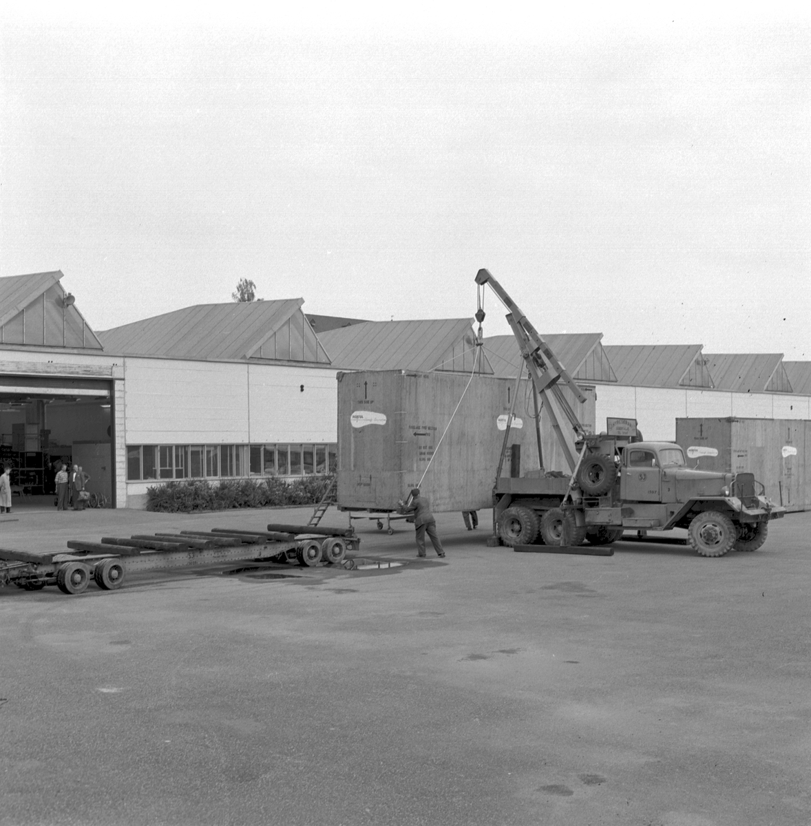 Lossning av helikopter i emballage från låglastande släpvagn, vagnbjörn