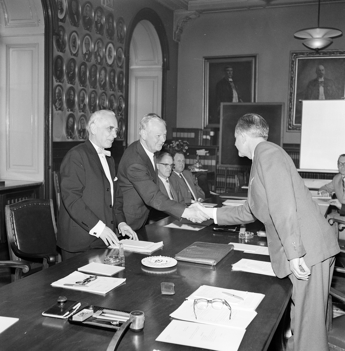 Uppvaktning, uppv för Överdirektör, Öd, Oredsson, Byråchef, Brc, E. Jonson, 1:a från vänster och Byråchef, Brc, H. Siedman, 2:a från vänster, på företagsmöte i plenisalen. SJM-ordförande G. Kolare uppvaktar