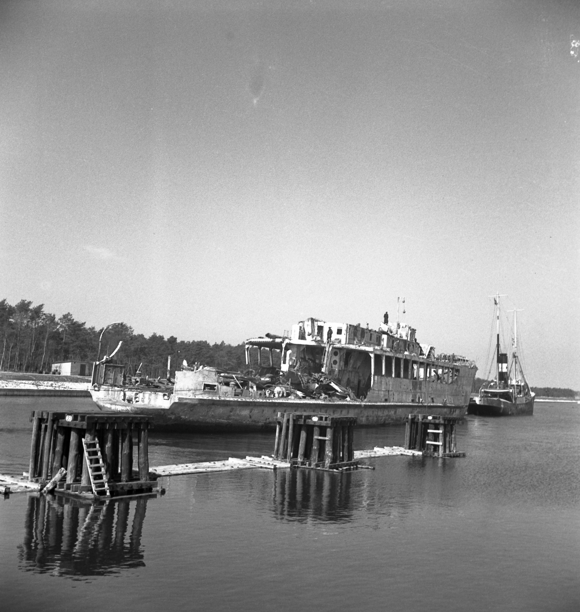 Den förlista isbrytande färjan Starke bogseras efter bärgning. Här i Falsterbokanalen på väg till Kockums i Malmö.