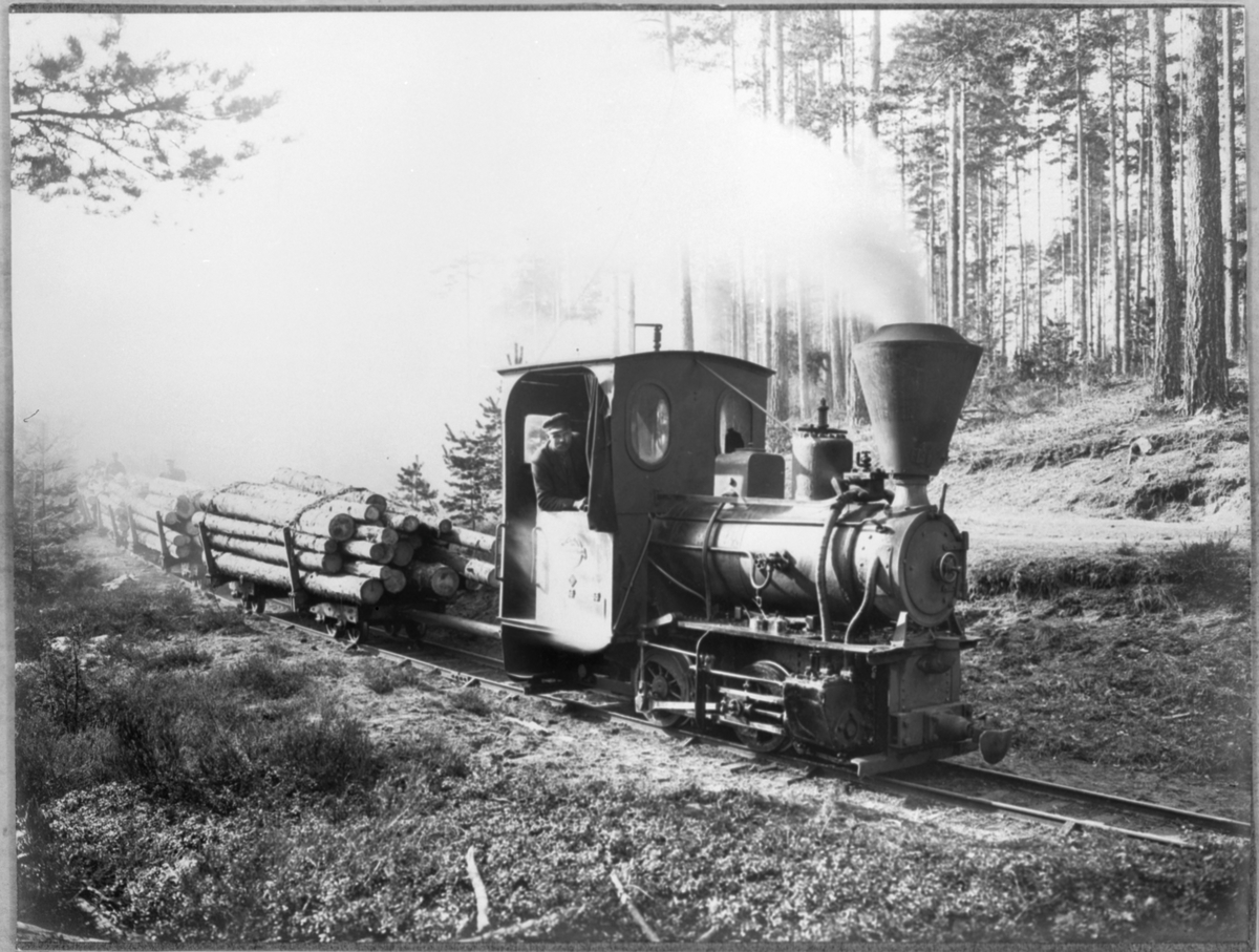 Ångloket "Sotsara" med timmerkoppel på väg mot sågverket i Ålhult. Ålhultsbanan sträckte sig vid sjön Ören-Gullringen