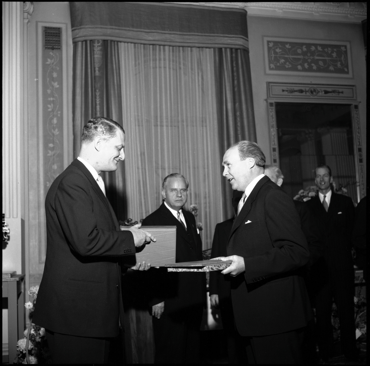 Generaldirektör Erik Upmark tar emot gåvor från Sydkraft, VEGETE-bolagen, SAL, Sv. Turisthot Riksförbund.