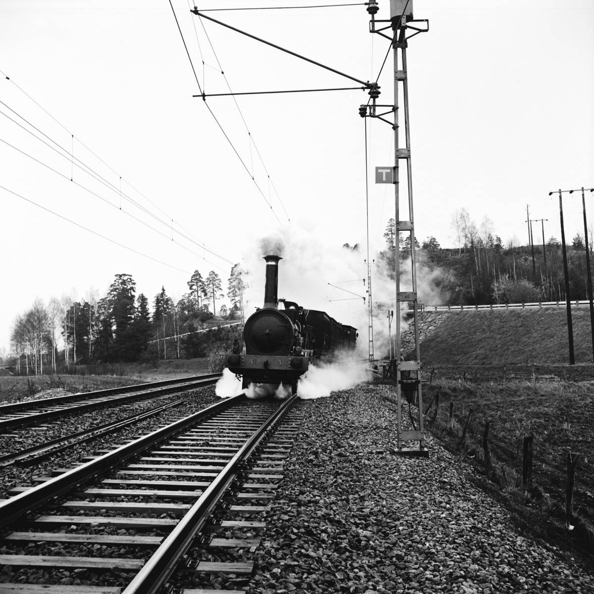 Historiska tågets resa från Stockholm till Göteborg för invigningen av Tåg 62. Sträckan Södertälje-Gnesta. SJ B 3 "Prins August". KHJ CD 13. SJ C 182. SJ AB 289. SJ A 103. SJ C2b 329