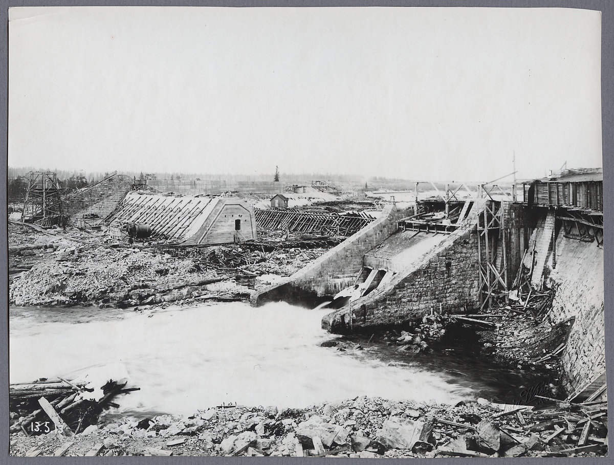 Porjus kraftverk i Stora Luleälv under byggnation. Vy nedströms över stora skibordet. Varmhuset är nu rivet.