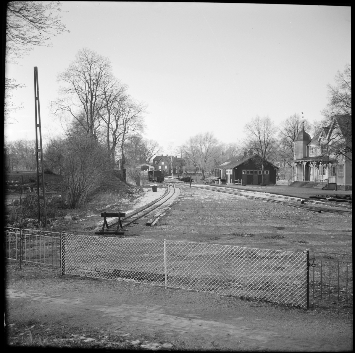 Vy över järnvägsstationen i Mariefred som användes av Museijärnväg Östra Södermanlands Järnväg, ÖSlJ. Stationhuset till höger i bild.