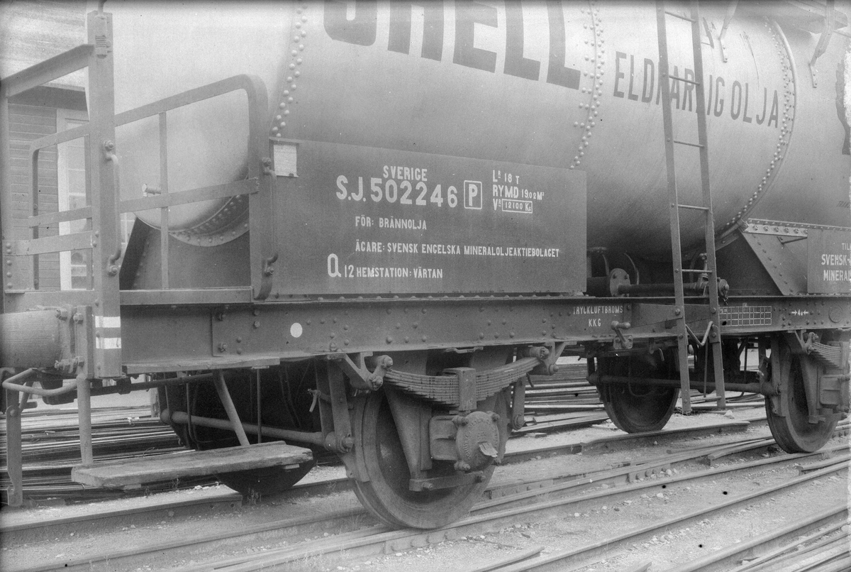 Underrede på tankvagn. Privatvagn ägd av Svensk-Engelska Mineralolje AB, registrerad hos Statens Järnvägar som SJ Q12 502246,. Här på fabriksområdet hos Aktiebolaget Svenska Järnverkstäderna i Linköping.