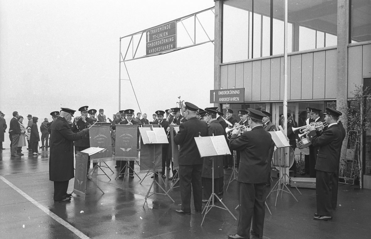 Invigningsresa med M/S "Gustav Vasa". Levererades 10 april 1965 till Lion Ferry Ab, Halmstad. Utchartrad samma dag till Statens Järnvägar, SJ, Malmö. Blåsorkester