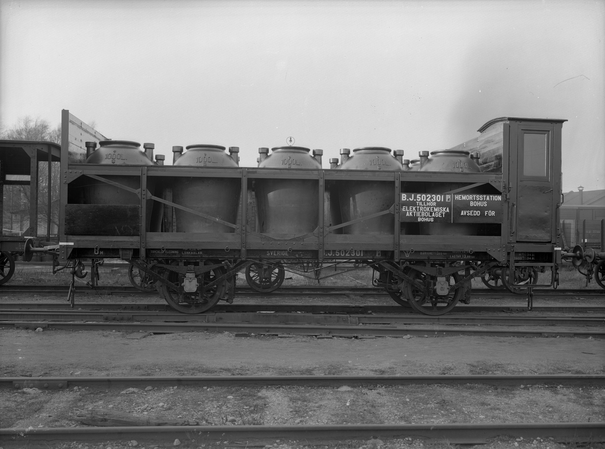 Bergslagernas Järnvägar, BJ Um 502301. Syravagn med keramiska krukor för saltsyra. Före detta Åmål - Årjäng Järnväg, ÅmÅJ-vagn.