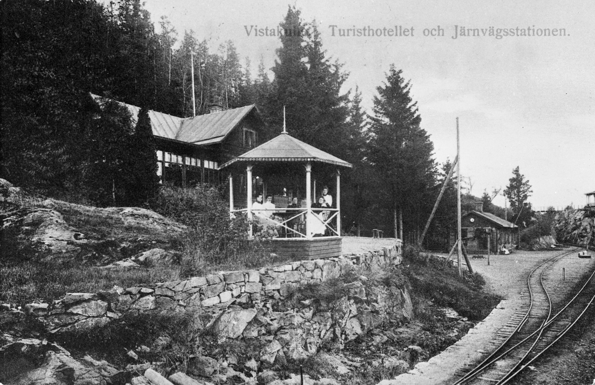 Titel: Trafikplatsen öppnad 1894. Station och turisthotell. Båda byggnaderna finns kvar.