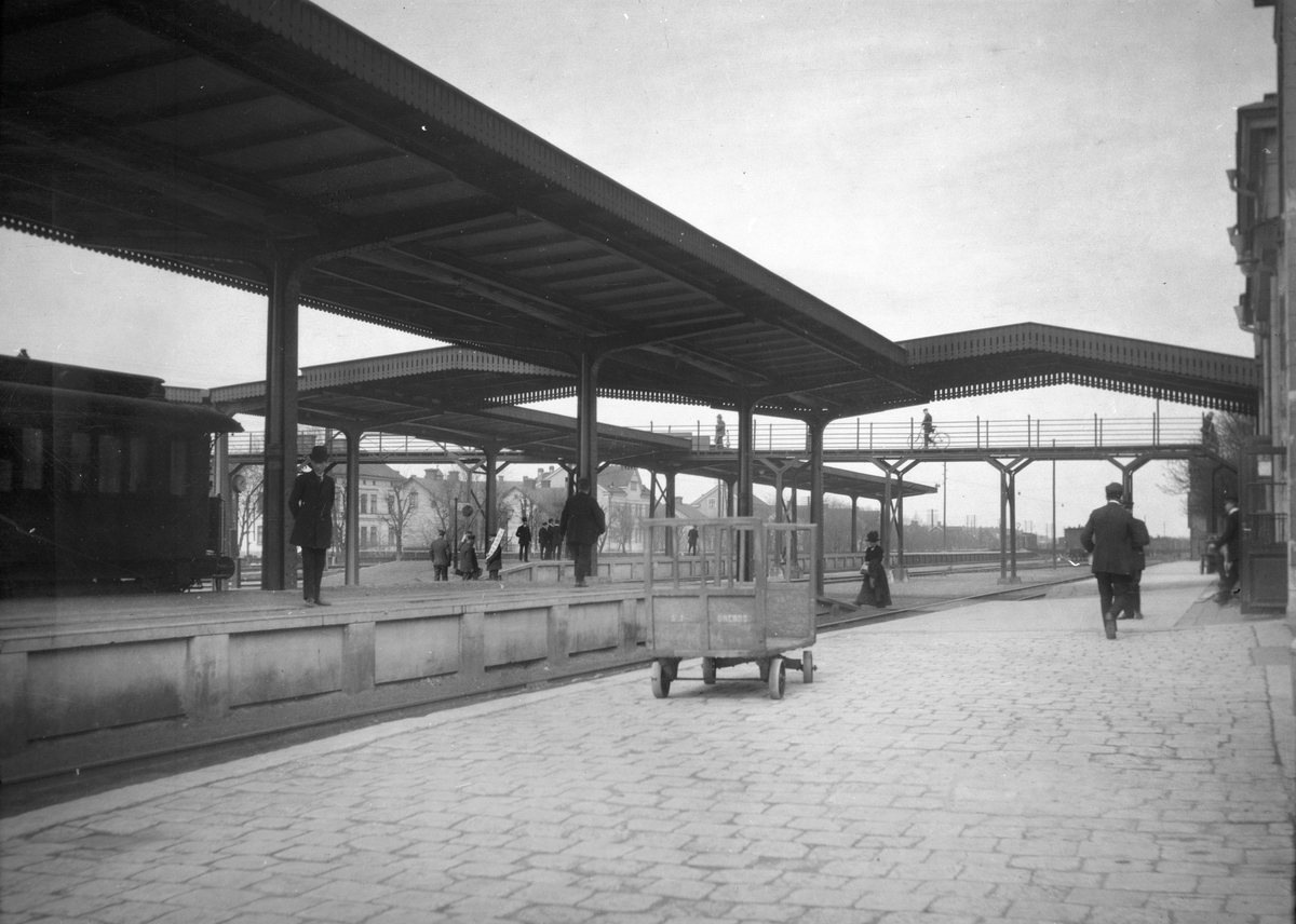 Plattformar vid centralstationen.Spårsystemet utvidgades 1910. Genom borttagande av andra och fjärde spåret kunde breda plattformar anläggas mellan tågspåren.